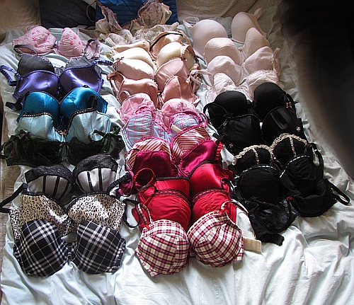 Kiedyś miałam dwa czarne i jeden biały i mi to wystarczało. Potem doczytałam że ten mój rozmiar jest może nie do końca OK, przegrzebałam oferty kilku firm, znalazłam w krk sklep firmowy jednej i upolowałam turkusowy, różowy, kremowy z zielonym haftem i kremowy w pastelowe kwiatki. A potem z nich wyrosłam i przeżyłam szok estetyczny (w głupim 70F był bardzo mizerny wybór, jak teraz patrzę to sytuacja wygląda duuużo lepiej). A potem dzięki uświadomionej siostrze odkryłam M&S i La Senzę i złapałam kolekcjonerską żyłkę